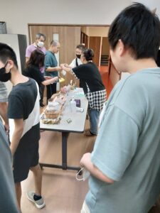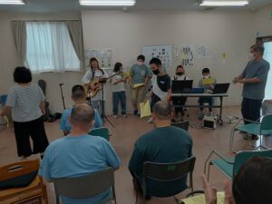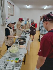 昼食は利用者さんと参加者の皆様で力を合わせ焼きそば作り、食べ比べをしました。そしてアンビションさんのパンを届けて頂きました。ふわふわのサンドイッチは好評でした。午後は音楽ユニット「submarin」の演奏会、利用者さんも一緒に歌やダンスで参加しました。茶話会は麦の会第三作業所さんが出張販売にきてくださり、美味しいお菓子を皆さん購入されていました。